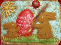 Kuchenteig in Form gebacken, mit gefärbten Puderzuckerguss angemalt